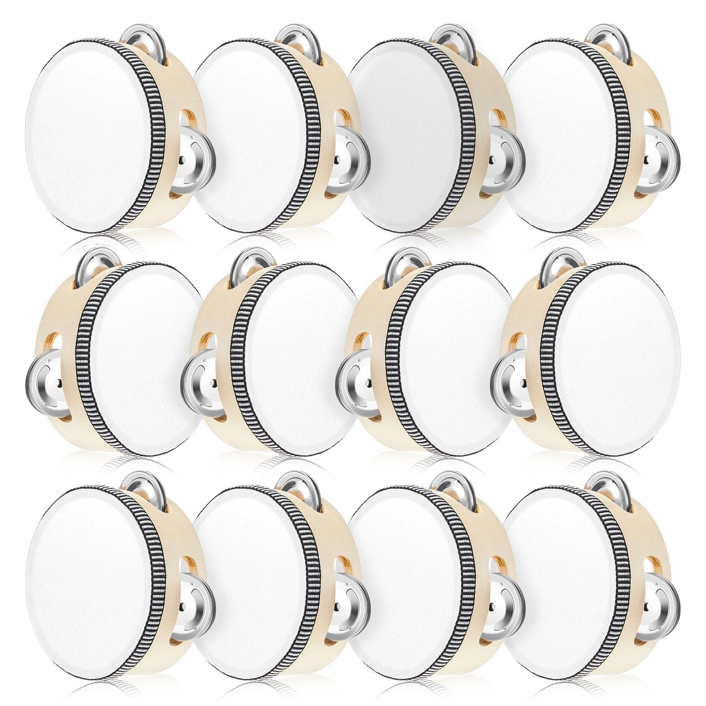12 Pcs Wedding Tambourine Drum for Adults Hand Held Percussion Gift Wood Metal Jingles Musical Educational Drum Instrument for Church Wedding Party Games(White,4 Inch)