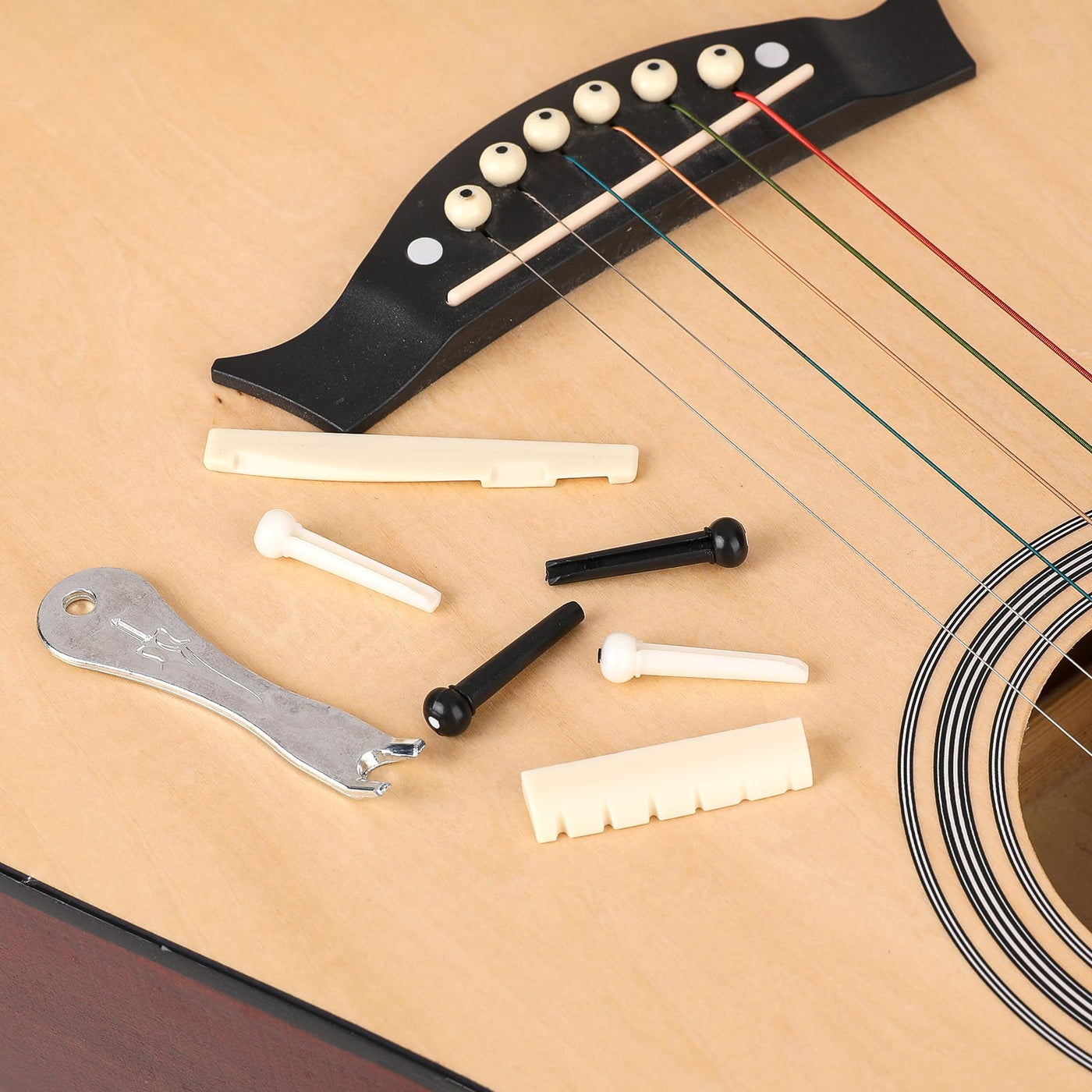 - Wide ApplicationThe guitar string pegs replacement parts tools Kit is suitable for most acoustic guitars, folk guitars, ukuleles, classical guitars, etc. It is an ideal tool for guitarists to maintain their guitars and change strings.