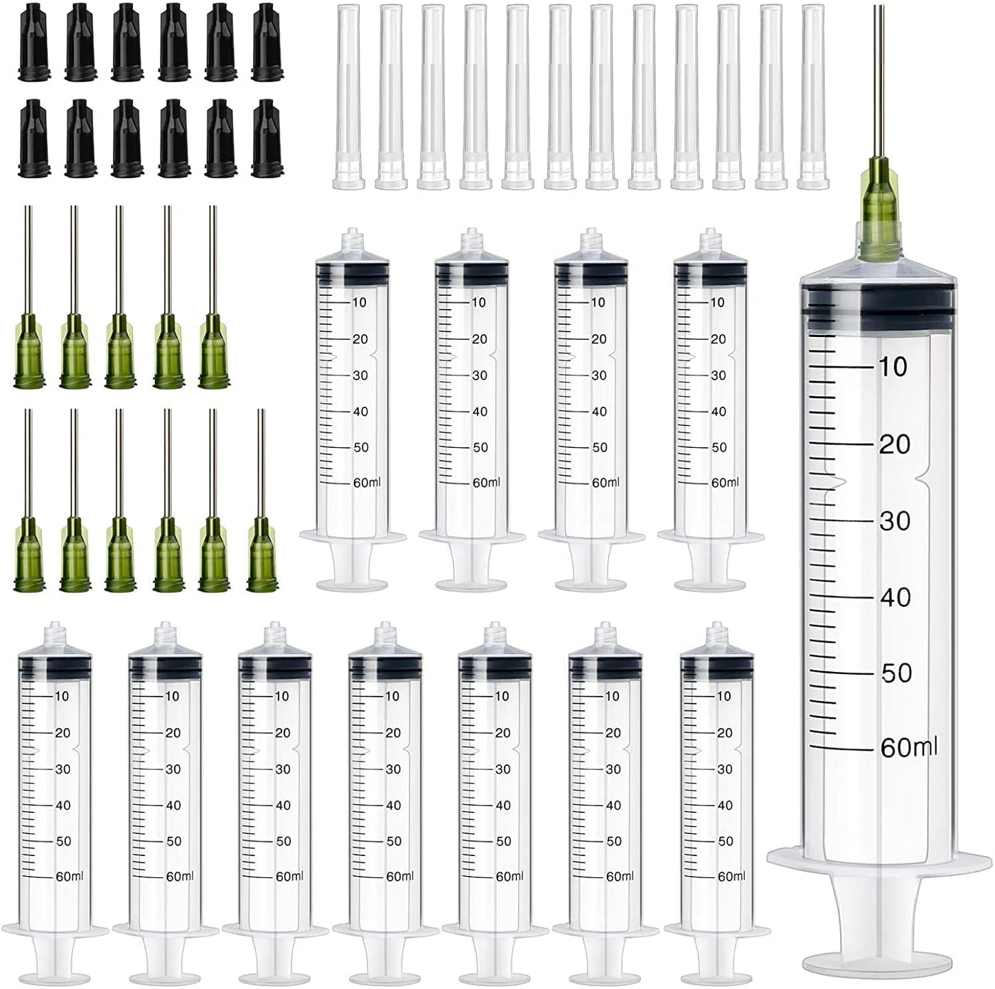 Specifications: Our syringe calibrations are large and clear, easy to see through. Syringes have many uses and a package of 12 can meet your great requirements. Package includes: 12 x 60 ml syringes. 12 x 14G 1 inch needles with blunt tip. 12 x plugs with black tip. 12 x caps. Note: 1. Small items, please keep away from children. 2. These syringes are only suitable for industrial use. Not for medical use.