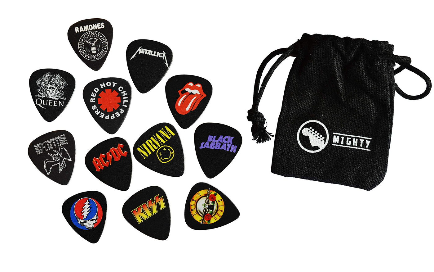 12 x Classic Albums Guitar Pick Set. Guitar Plectrums & Picks For Every Guitarist. Double Sided Printing Plectrum Set Guitar Plecks Do you want an epic gift to suit a guitar player of any ability? Our Classic Albums Guitar Picks Sets with guitar pick holder bag might just be the answer! Featuring 12 picks of varying thickness to suit every type of player youll love these album cover picks guitar picks band. Whether you're a breezy acoustic rhythm player after acoustic guitar picks, or sweep picking metal god looking for electric guitar picks, we've got your back and pride ourselves on our top notch guitar accessories and guitar tuner. They can even be used with mandolin or as a ukulele pick. Plectrums for electric guitar. Each set contains images of seminal guitar albums with double sided, high quality print and a handy gift bag to keep them in. A great guitar gift or personalised guitar picks set for anyone who loves guitar & gear accessories or bass guitars & gear or picks & pick holders. We love electric guitar accessories and plectrums for acoustic guitar! About our guitar pick sets Each set contains picks of varying thickness from 0.46, 0.71, 0.81, 0.88, 0.96 all the way up to 1.2 mm. Unlike many plectrum sets, we use double sided, high quality printing. Featuring images from seminal guitar albums and some of the most iconic players of all time. Suitable for any level of ability. Work as plectrum acoustic guitar, electric guitar picks and our thicker picks can even be used as bass guitar picks. The perfect rock music gift for any guitarist or music lover. Handy drawstring gift bag included with each set making it the perfect gifts for guitarists. Mighty, great gifts for musicians and guitar gifts for men.
