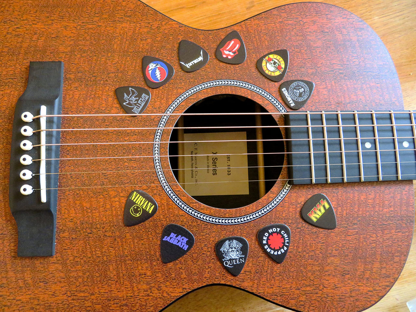- 12 High quality printed guitar picks with double sided print. Youll love our custom guitar picks and personalised plectrum. We include a flexible bag instead of a guitar pick tin. Album cover picks or guitar plecks