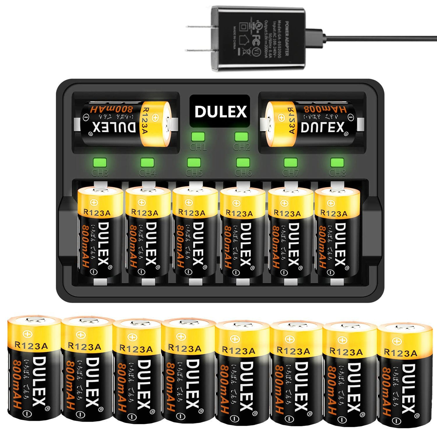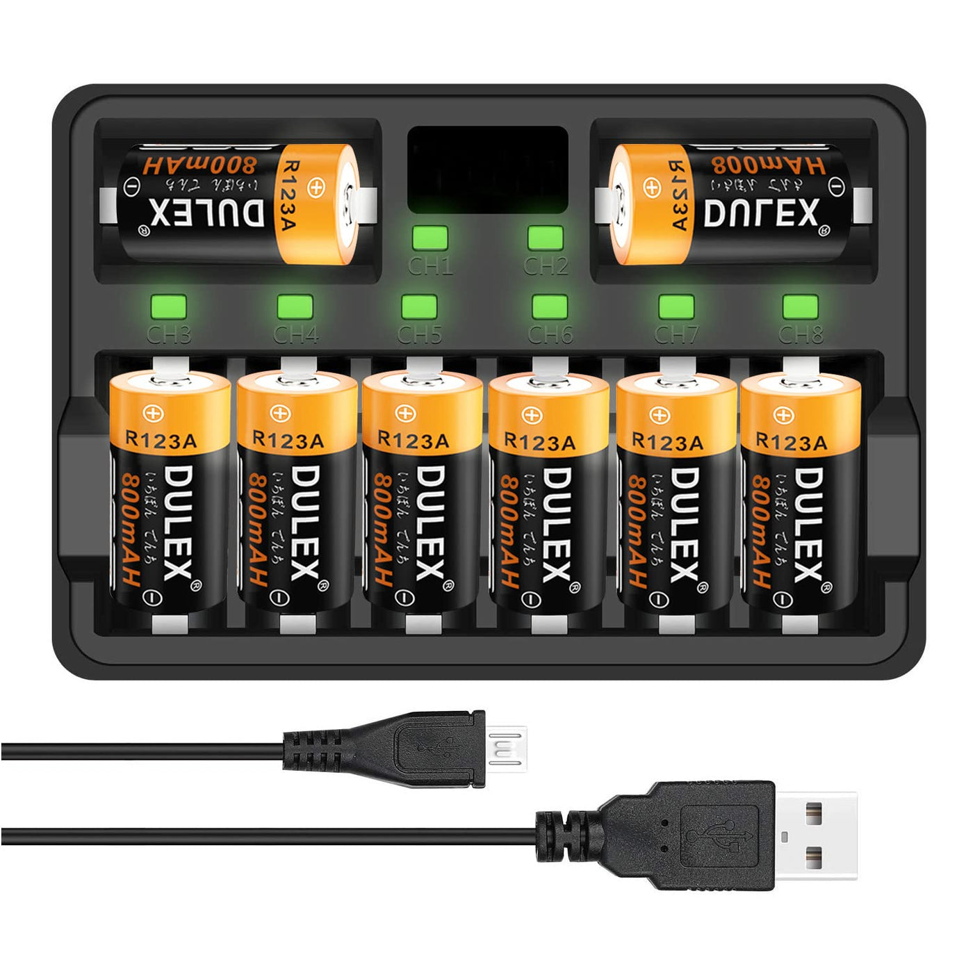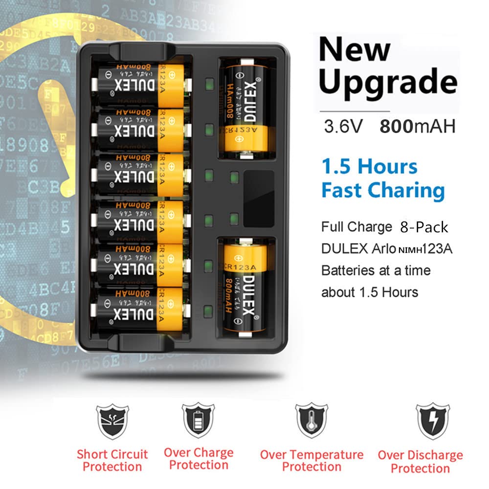 - MULTI COMPATIBILITY: Rechargeable batteries with Charger for Arlo Cameras, August Pro Wifi, CR123A LED flashlights, video game consoles, appliances, medical equipment, calculators, memory backup and others electronic devices. 3.7V NiMH 800mAh High Capacity provides the best run time possible Ideal for rechargeable Arlo batteries for Arlo cameras.NOTE: FULLY CHARGE THE BATTERIES BEFORE FIRST USE.