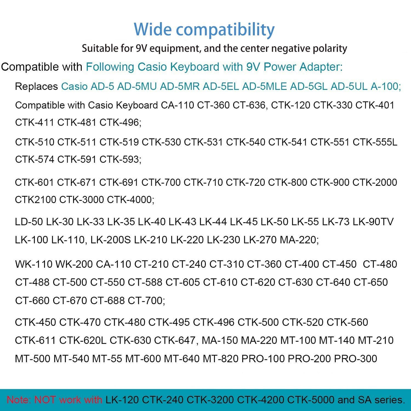- Compatible: Replacement power adapter for P/N AD-5 / AD-5UL / AD-5MU / AD-5MR / AD-5MLE / AD-5ML / AD-5GL / AD-5EL. For LK Series: LK-43JC LK-44 LK-45 LK-46 LK-48 LK-50 LK-50S LK-55 LK-56 LK-60 LK-70S LK-73 LK-78 LK-90 LK-93TV LK-94TV; MT Series: MT-100 MT-140 MT-205 MT-210 MT-240 MT-35 MT-36 MT-400V MT-500 MT-540 MT-55 MT-600 MT-640 MT-820 / MA-150 / MA-170 MA-220 / CPS-101 LD-50 HT-700 HT-6000 CA-100 CA-110 / WK-110 WK-200 WK-210 / PRO-100 PRO-200 PRO-300.