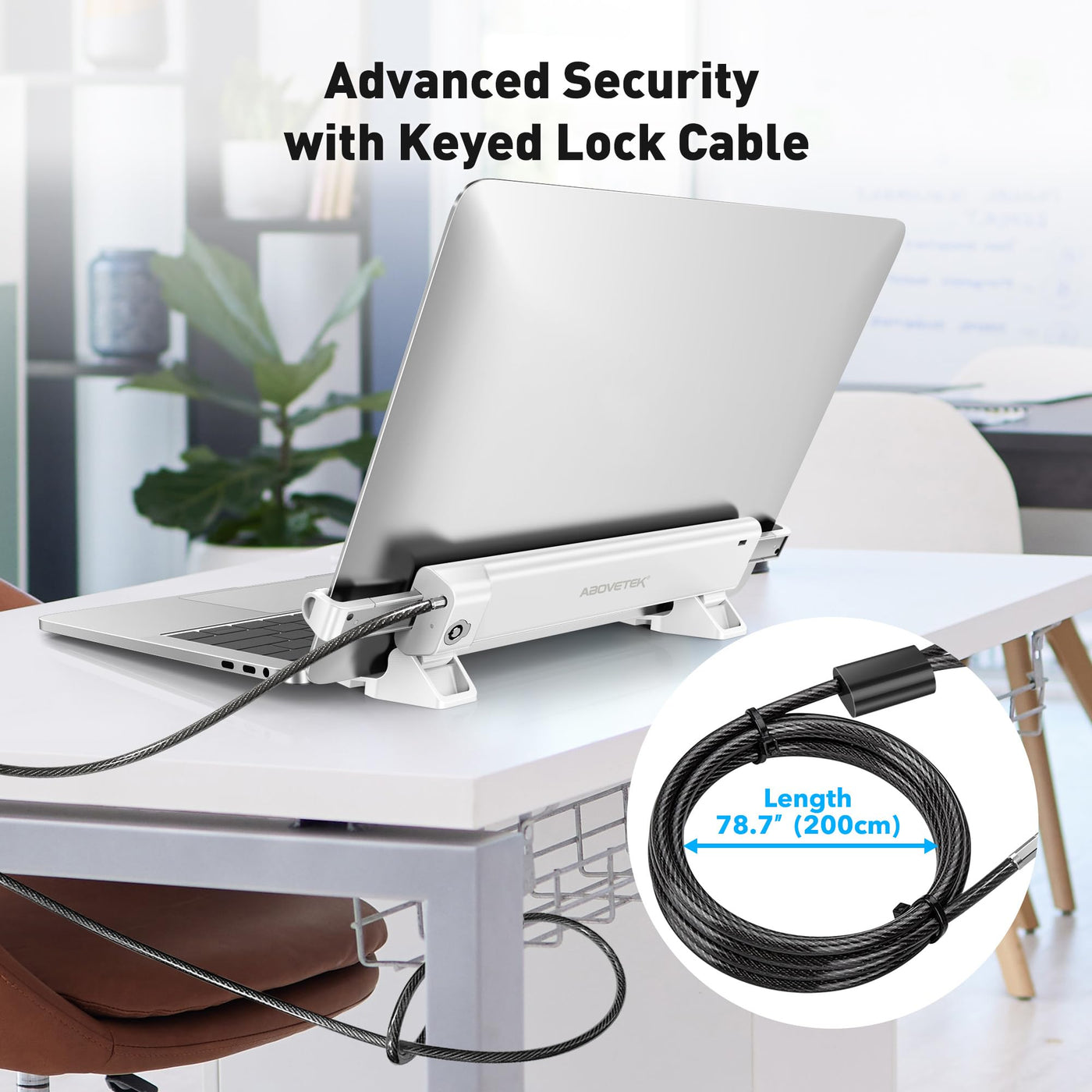 - Enhanced Security with Keyed Lock and Long Cable: The AboveTEK MacBook locking comes with a keyed laptop lock and a lengthy 78.7-inch (2m) cable, ideal for securely tethering to any fixed structure. It also includes mounting options for desk attachment, ensuring your laptop stays safe and secure.