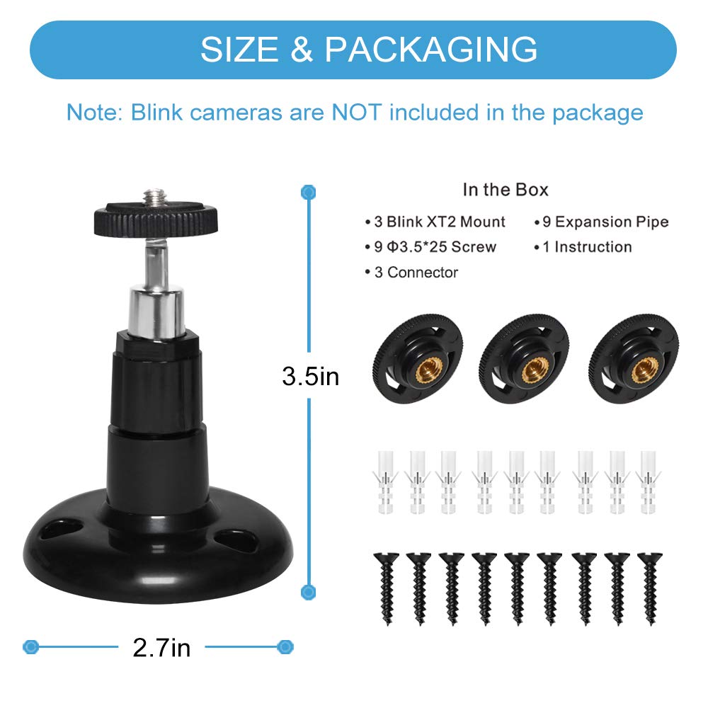 Easy and Sturdy Installation with A Single Press. Also easy to take the camera down if you need to get the battery charged.Easy Angle AdjustmentCan be rotated through 360 Degree Swivel and 90 Degree Tilt Loosing the plastic nut to get the angle adjustable Locking the plastic nut after pointing to the angle you need. Specially Note: The blink cameras or COVERS are not included. For more Blink accessories such as Blink covers, Please search --" Blink Mount"Packing List: 3 blink xt/xt2 mounts3 Connector 9 expansion pipes 9 3.525 screws 1 instruction Mount Size: 2.73.5 in