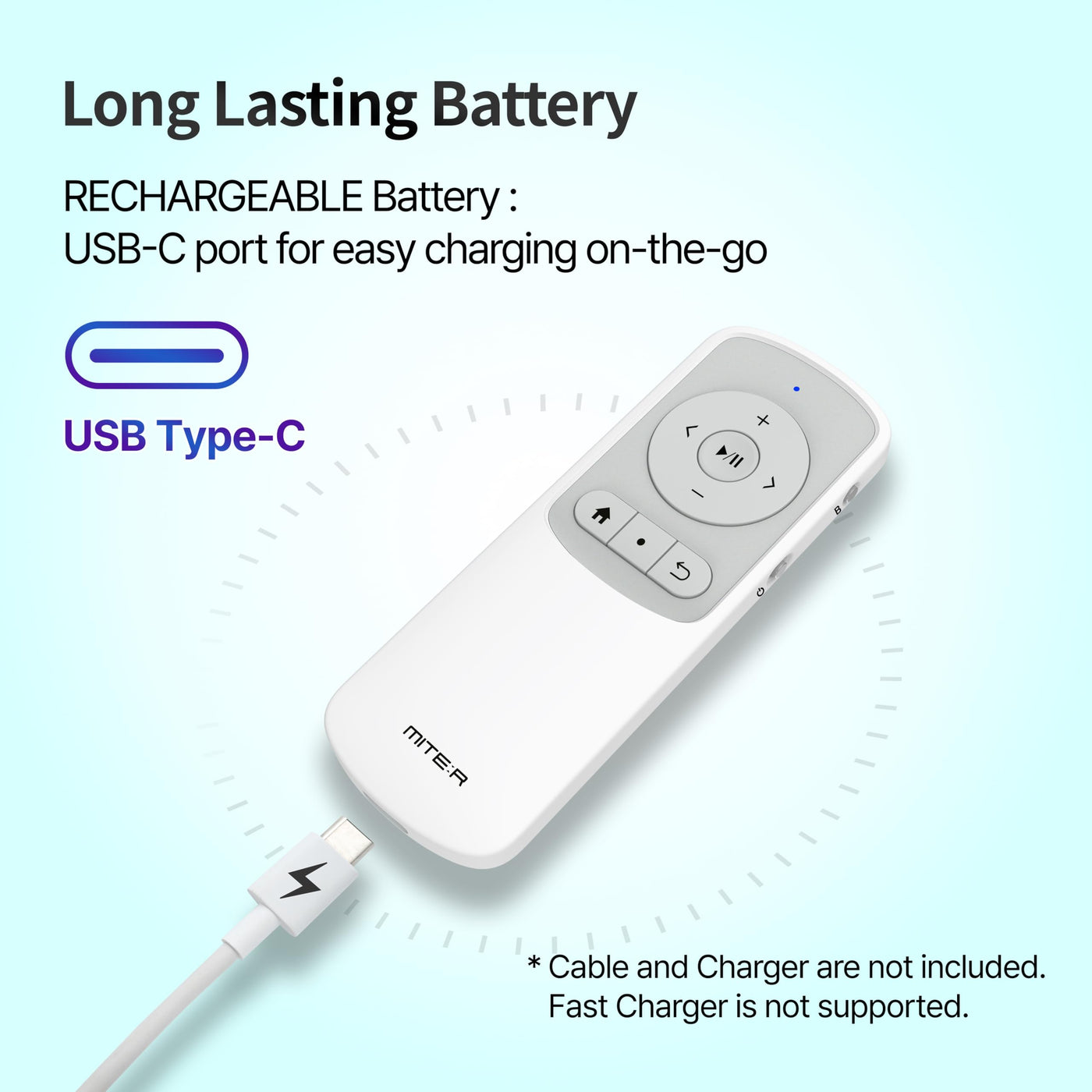 - Multi-Function Remote Controller Not only control of e-book page-turning, This remote controller also allows to control of camera selfies, videos, music, short-form contents(adjust volume, go forward-backward, play pause), and other ebook apps. Long-lasting built-in battery life, chargeable with Type-C USB cable. With a wrist strap, you can carry this remote controller wherever you want to go. Bluetooth 5.0 support, BT communication distance 10m(32ft), Lightweight 27g(0.95oz). Package Includes Bluetooth Remote Controller, Wrist Strap, and Manual(No type-c cable and charger). Made in China, Designed by MITER in Korea.