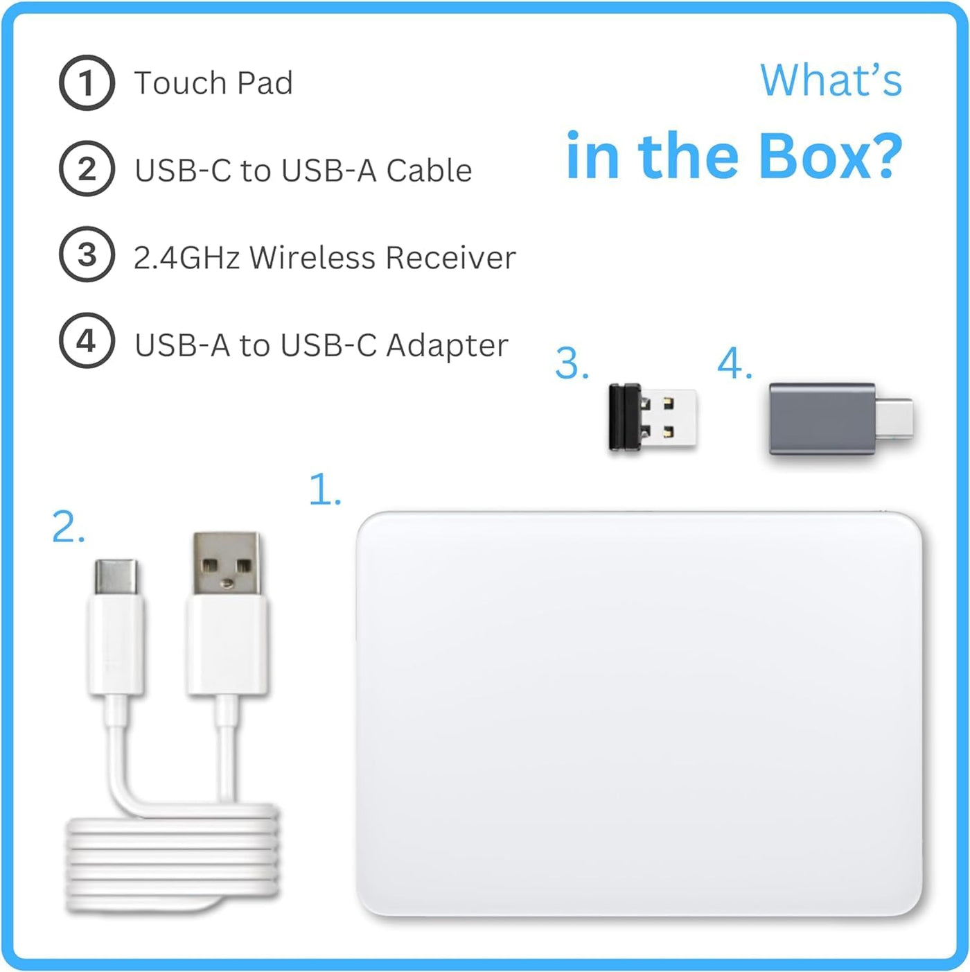 - 5: The box contains: trackpad x1/manual x1/cable x1/2.4G receiver x1/USB to type-c connector x1.