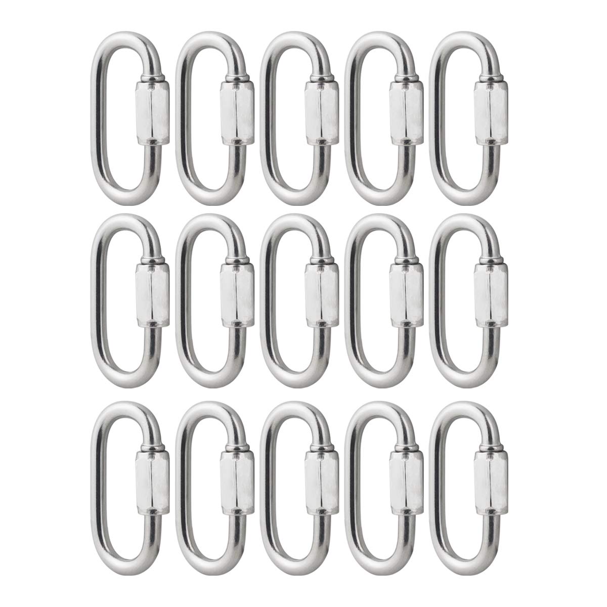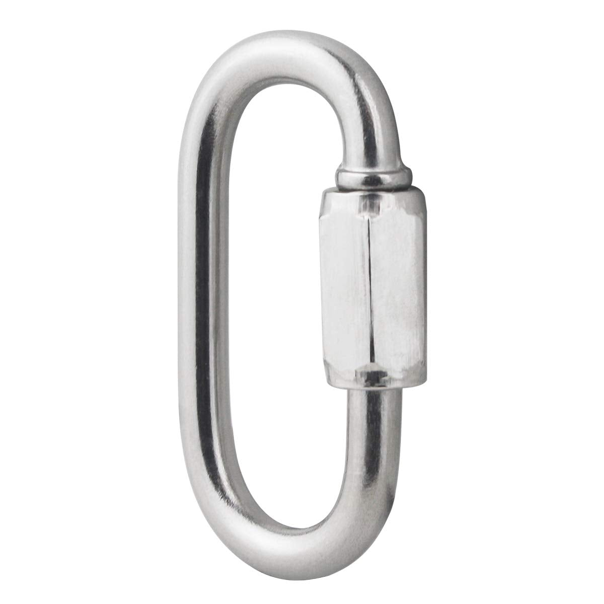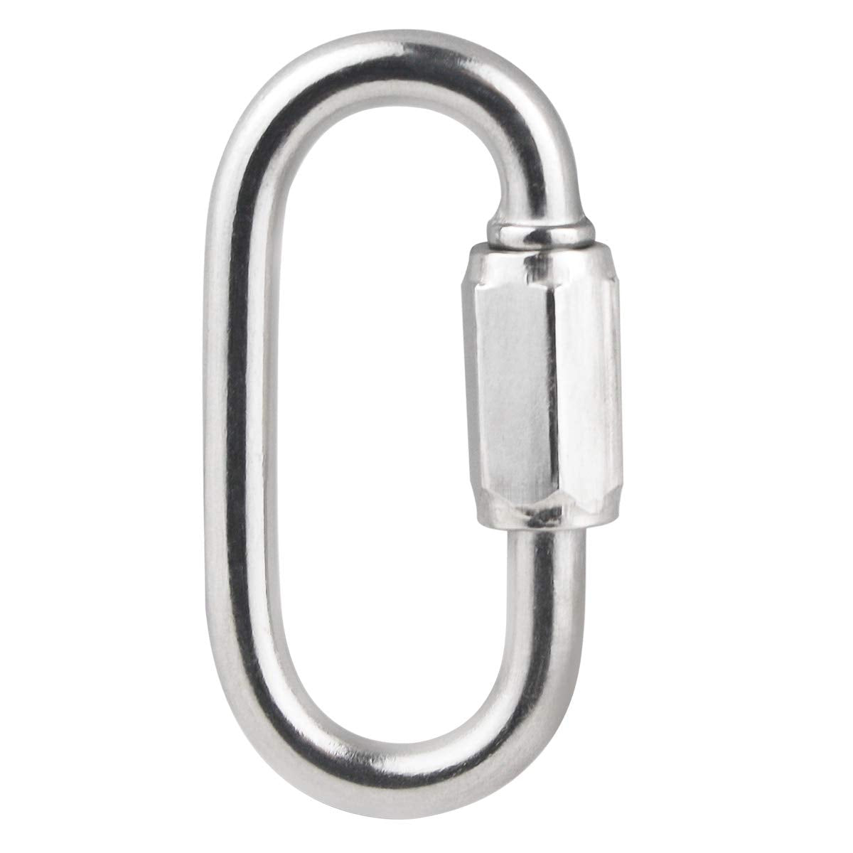 Quick links are the quickest way to link or repair chain. It can be applied in many ways: Including lifting and rigging, holding cables or leashes, supporting slings, hanging swings and hammocks, securing or hanging gym equipment, boating, camping and various sports and entertainment equipment. Features: Quick link carabiners anti-corrosion Passivated for superior corrosion resistance, good quality Material and durable. Premium-grade quick links for chain/rope,cable connections; threaded-nut closure for added security. Excellent choice for boating, sailing, marine and other harsh- condition applications. Quick and simple fastener,useful for attaching chain or cable. Notice:When you use it,need to twist the screw tightly. Match working load limit to the of the chain you will be using. Not to be used for overhead lifting. Multifunctional: You can use it for backpack, key ring, chains, ropes, camping, hiking, fishing, pet, indoor outdoor equipment gear, accessories. Rust-Prevention: Anti-corrosion and durable meterial. Made of 304 stainless steel that protects against corrosion.Notice: Not for Climbing!