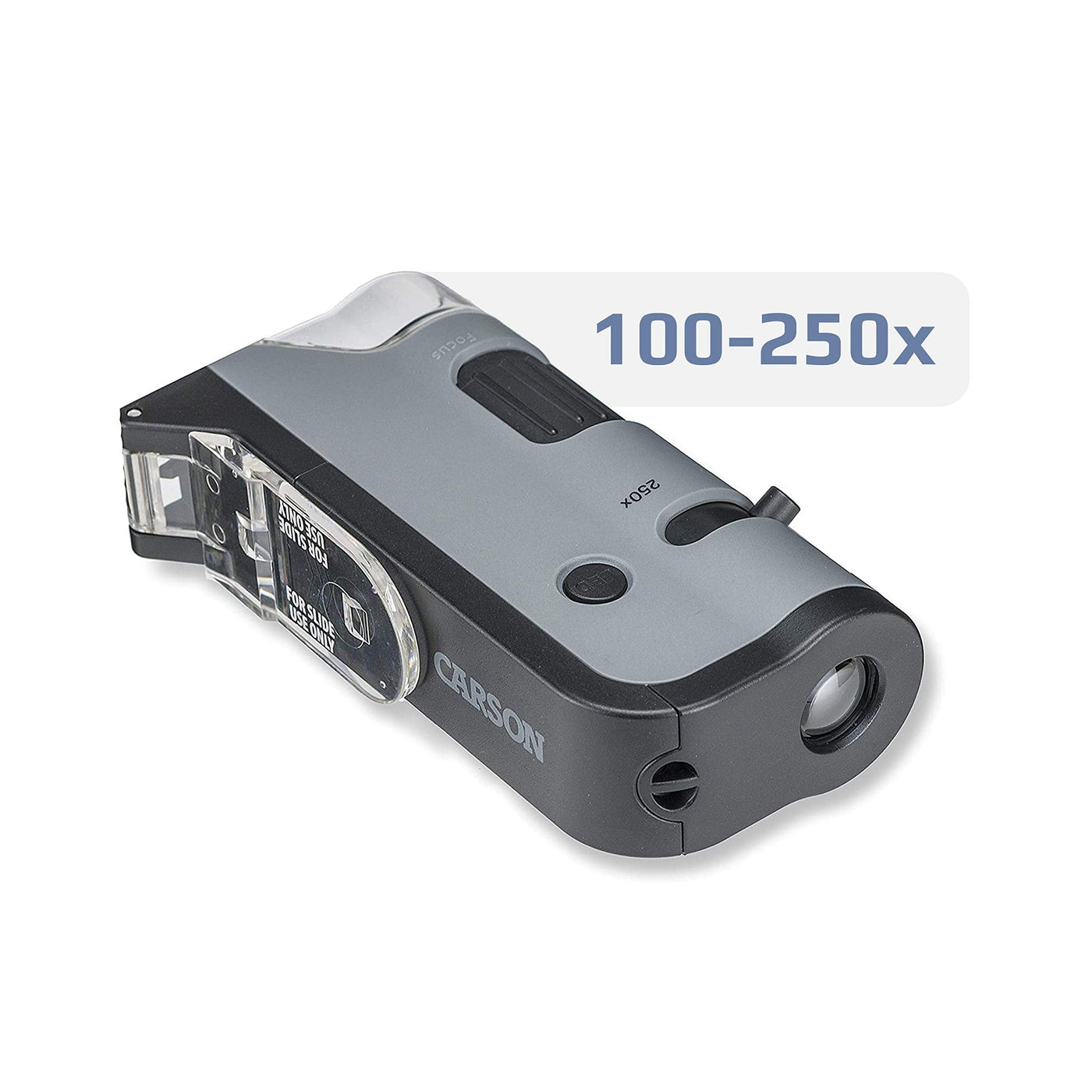 See your World in a Whole New WayThe MicroFlip is Carson's most powerful pocket microscope yet, with a magnification range of an impressive 100x – 250x. The precision molded aspheric lens system ensures sharp, clear, distortion-free viewing, allowing you to see a variety of incredible details.The MicroFlip uses a bright LED light to illuminate your subjects and also has a built-in UV LED flashlight feature to aid in inspection. The MicroFlip's innovative slide base flips down to hold your slides in place (we include one blank slide and cover slip to get you started), and then flips back up when using the microscope on objects out in the field. Its lightweight build, ergonomic shape, and thin wrist-strap make it easy to take along with you anywhere you go.The MicroFlip is a great microscope for both beginners and more advanced users alike, as it offers a higher magnification range, but is simple and easy to use. One of the most exciting features of the Micro flip is the included smartphone digiscoping clip that attaches the microscope to your phone camera, so you can document all of your findings and share them with colleagues, friends, and family. The clip is compatible with most smart phone models, including iphone, Samsung, LG, HTC, and more (thicker cases like Otterbox style cases may need to be removed before attaching the digiscoping clip).The MicroFlip is powered by one AA battery (not included), and includes a starter slide with cover slip and an attachable wrist strap.Carson. /strong> The MicroBrite Plus is backed by Carson. Carson will repair or replace your pocket microscope if it is found to have manufacturing defects in the materials or workmanship. Please note that due to the extremely powerful magnification of this pocket microscope that the focal distance is very short. Therefore, you must hold the microscope directly over your subject for optimal viewing clarity. Begin at the lowest magnification (100x) and adjust the focus until you have a clear view, then increase your magnification to your desired level.