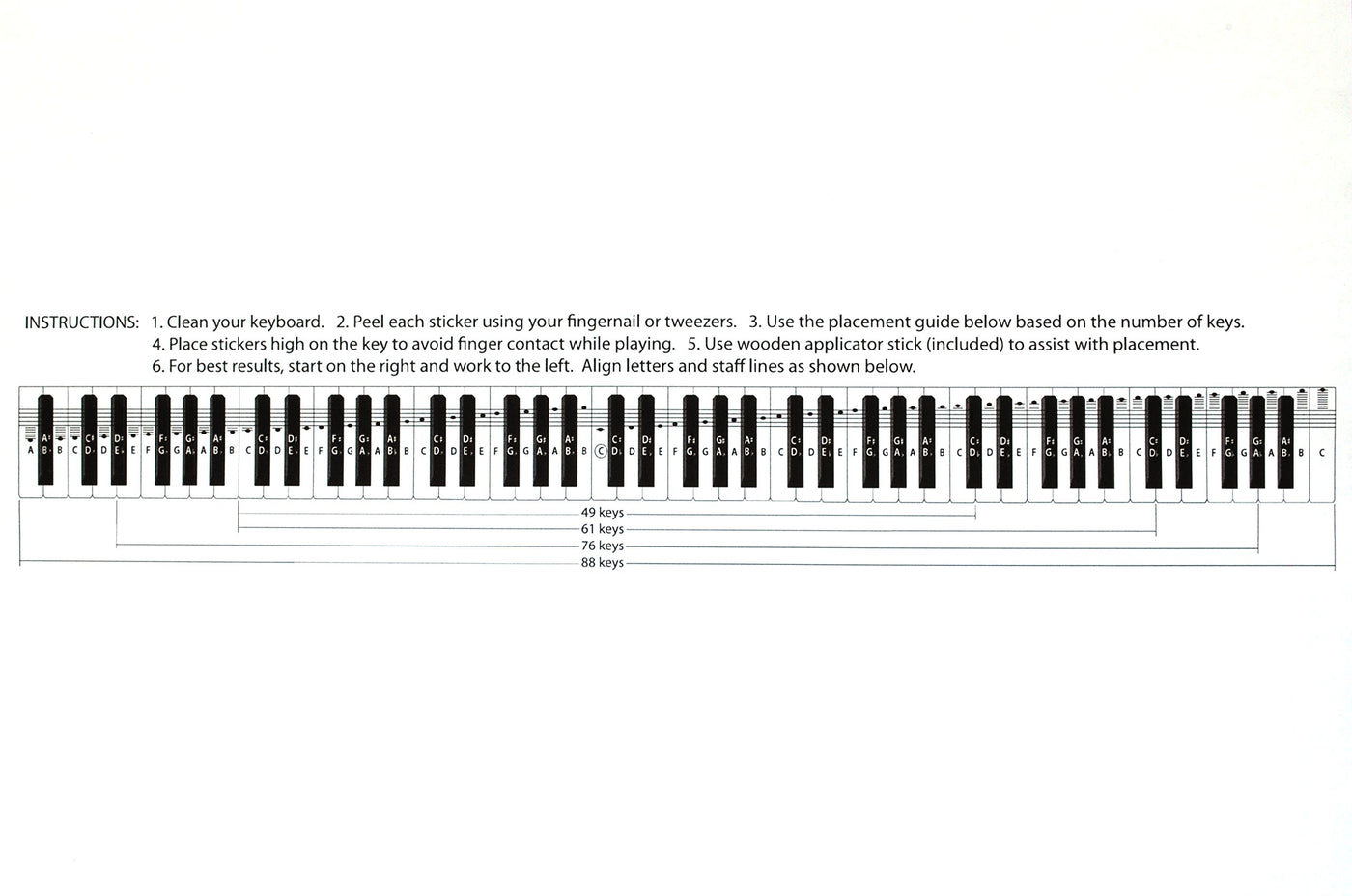 - COVERS ALL NOTES- Our keyboard stickers cover all black and white keys! (Many others only cover 4 octaves). You can use on a piano or electric keyboard with 49, 61, 76 or 88 keys. Includes detailed instructions for placement and a wood applicator stick.