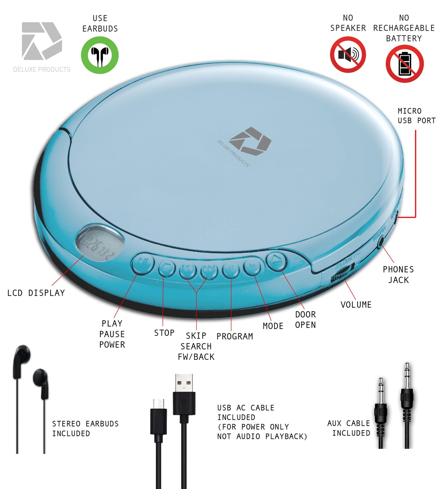 Deluxe Products CD Player Portable with 60 Second Anti Skip, Stereo Earbuds, Includes Aux in Cable and AC USB Power Cable for use at Home or in Car. Blue Blue_CD