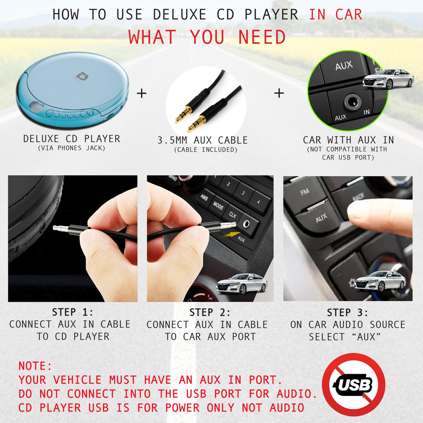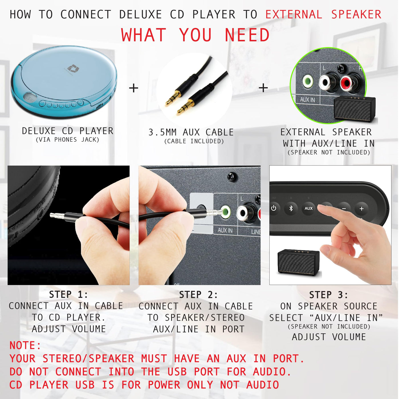 - Connect to Your Speaker or Car - Using the INCLUDED 3.5mm Aux in cable you can easily connect your Deluxe CD Players for home to your favourite speaker, or car! CAR AUDIO PLAYBACK USING ONLY AUX IN. USB PORT IS FOR POWER ONLY (NOT AUDIO)