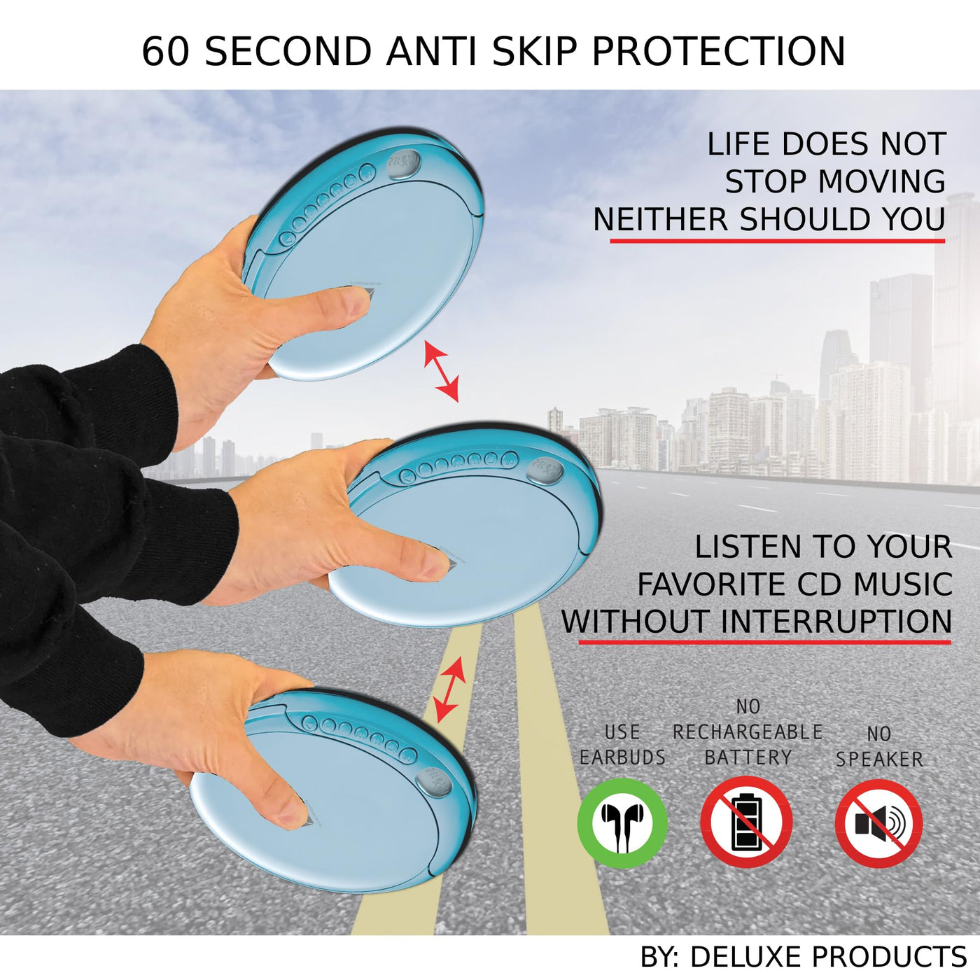 - Music On The Go - With the 60 Second Anti Skip protection CD Walkman. Do not let your everyday life interrupt your music! Take it with you on the bus! or While you take a walk outside (Please allow music to play for at least 60 seconds before moving for best performance)