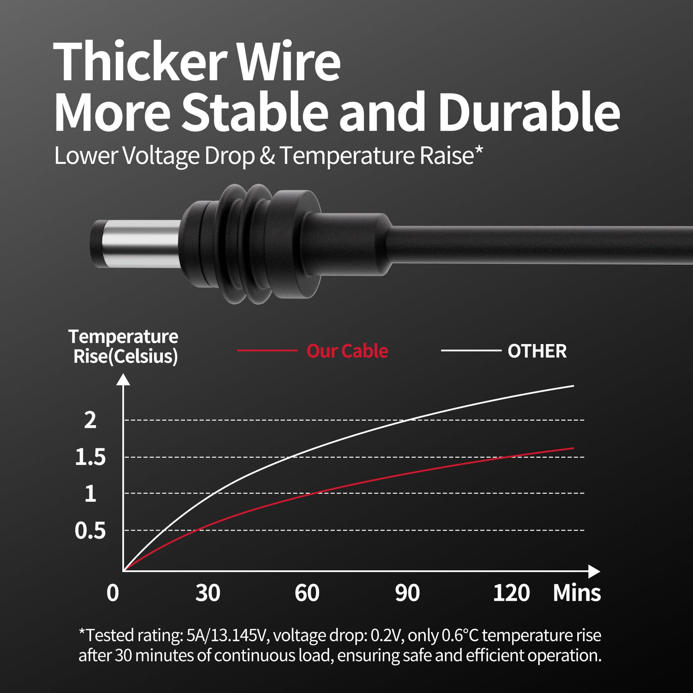 - Efficiency and Reliability: This dc power cable for Starlink Mini has excellent durability and efficient power capacity. Tested with a 13.145V power supply and 5A load, the voltage drop is only 0.2V. After 30 minutes of continuous load, the temperature rise is minimal at just 0.6C, ensuring safe and efficient operation.