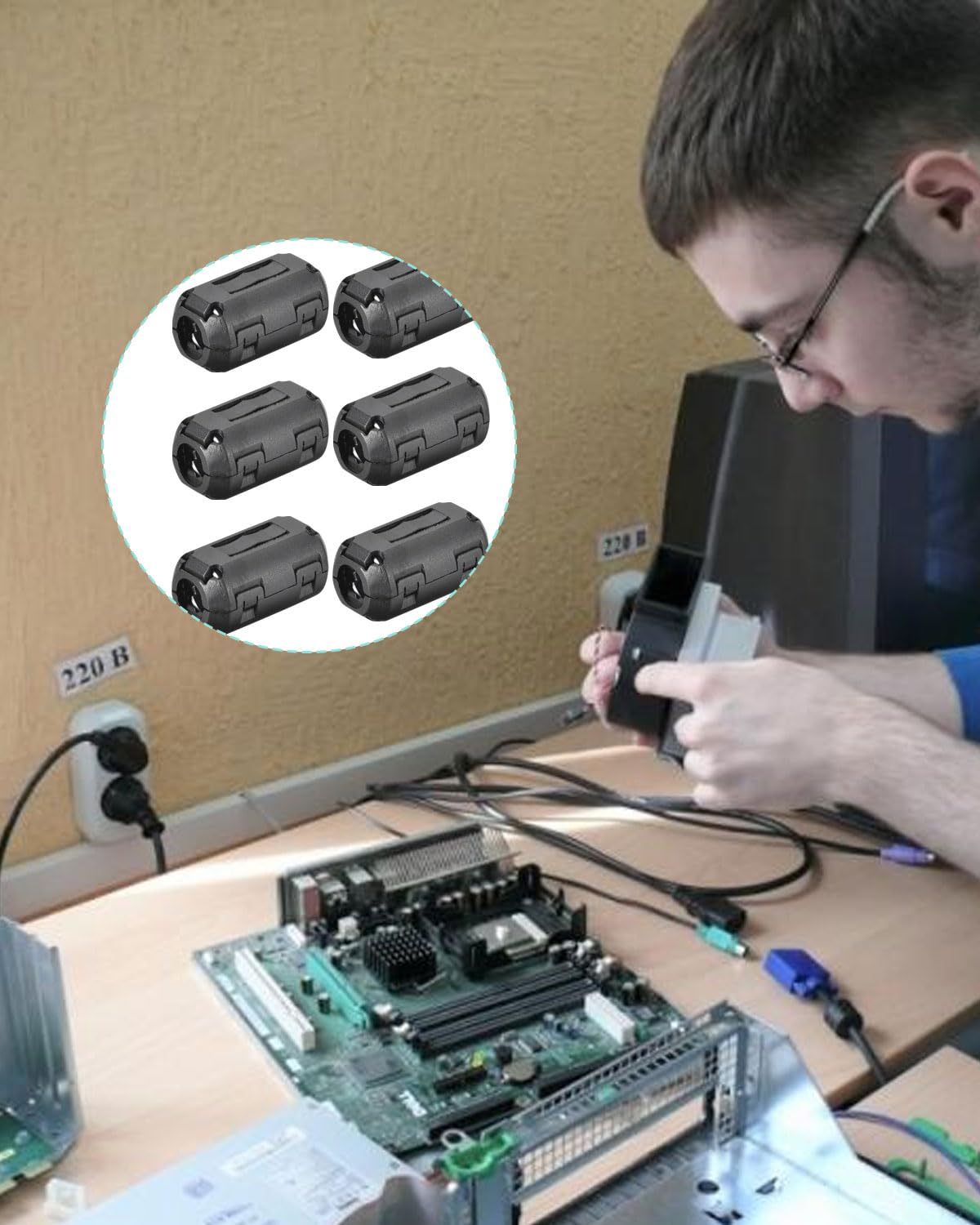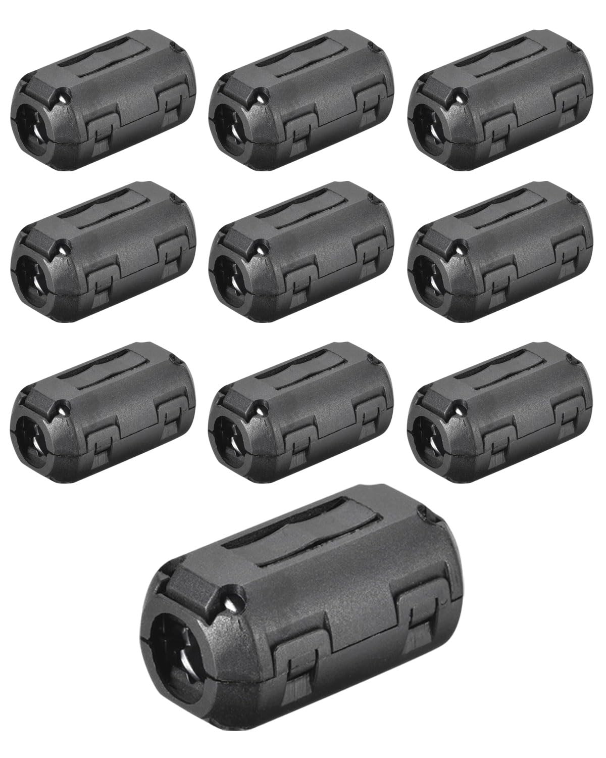 10 pieces anti-interference magnetic ring. Made of plastic housing and ferrite core. This connectable ferrite ring core is suitable for 3.5~5 mm cables. Clip-on ferrite ring cores effectively shield EMI and RFI interference and improve signal integrity. Please install them near interference sources. Easy to use. Simply attach it to the cable. The internal self-adjusting clip holds the cable securely in place and works for extended periods of time. The clip- on ferrite ring core can be clipped to power cord, USB cable, mouse cable, keyboard cable, headphone cable, video cable, audio cable and data cable.