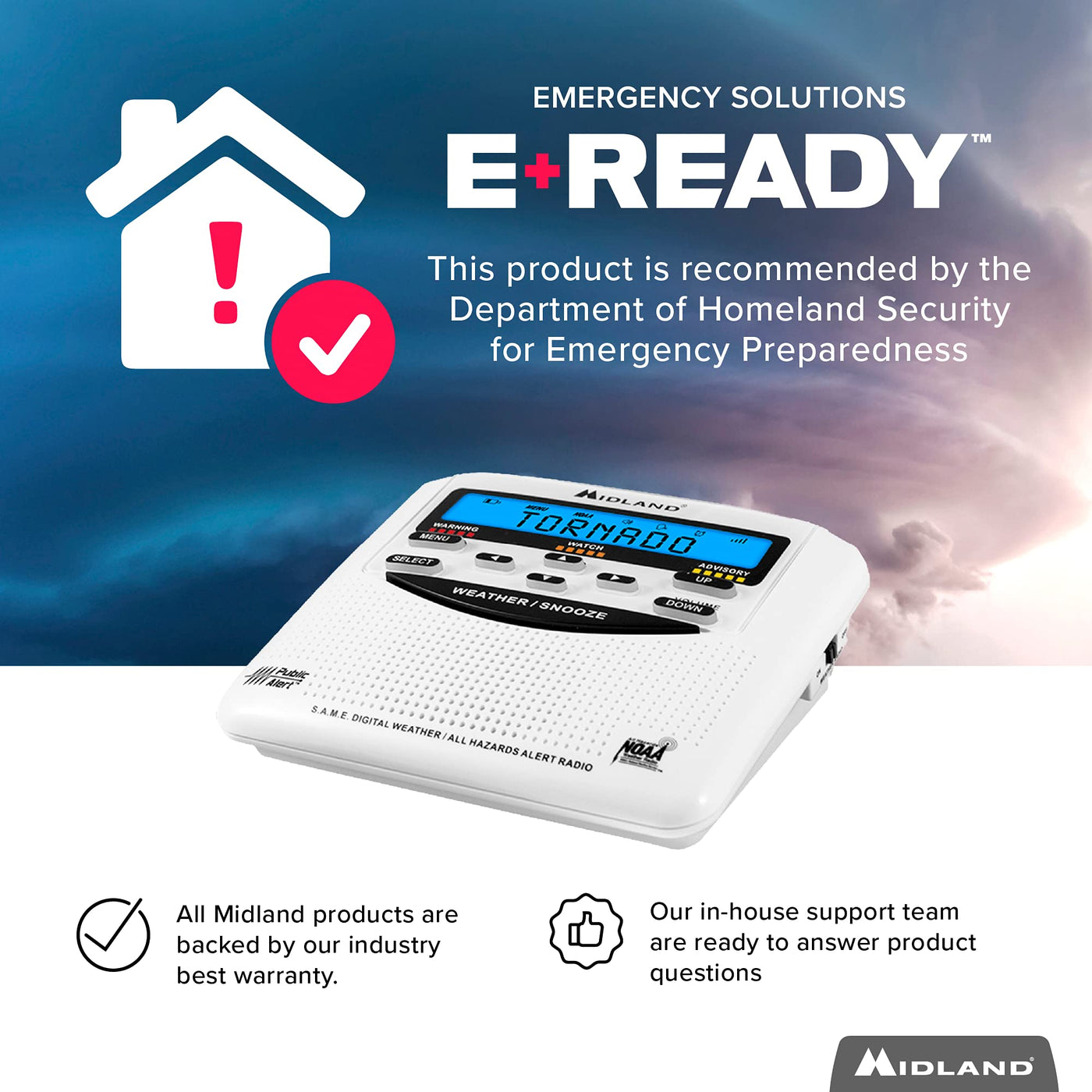 - Public-alert certified monitor receives 7 NOAA channels with flood, tornado, thunderstorm, and other warnings