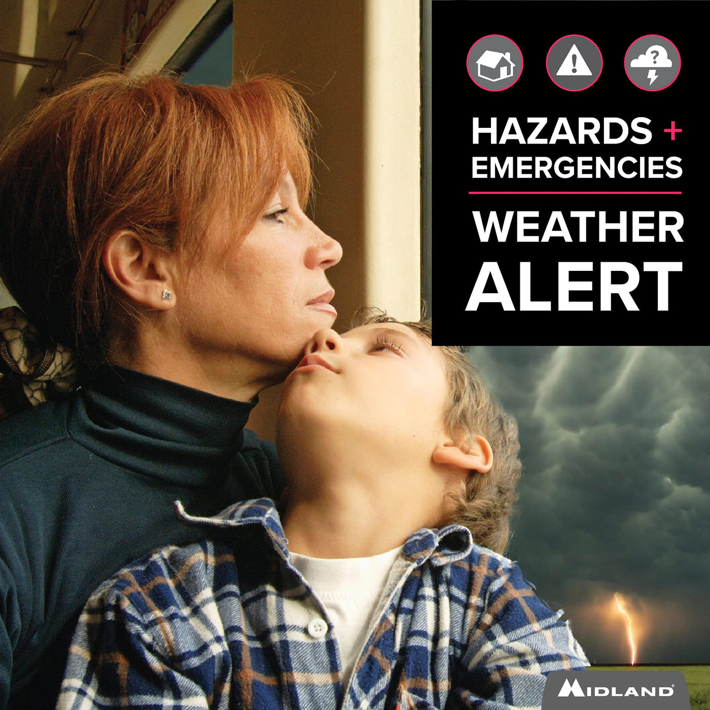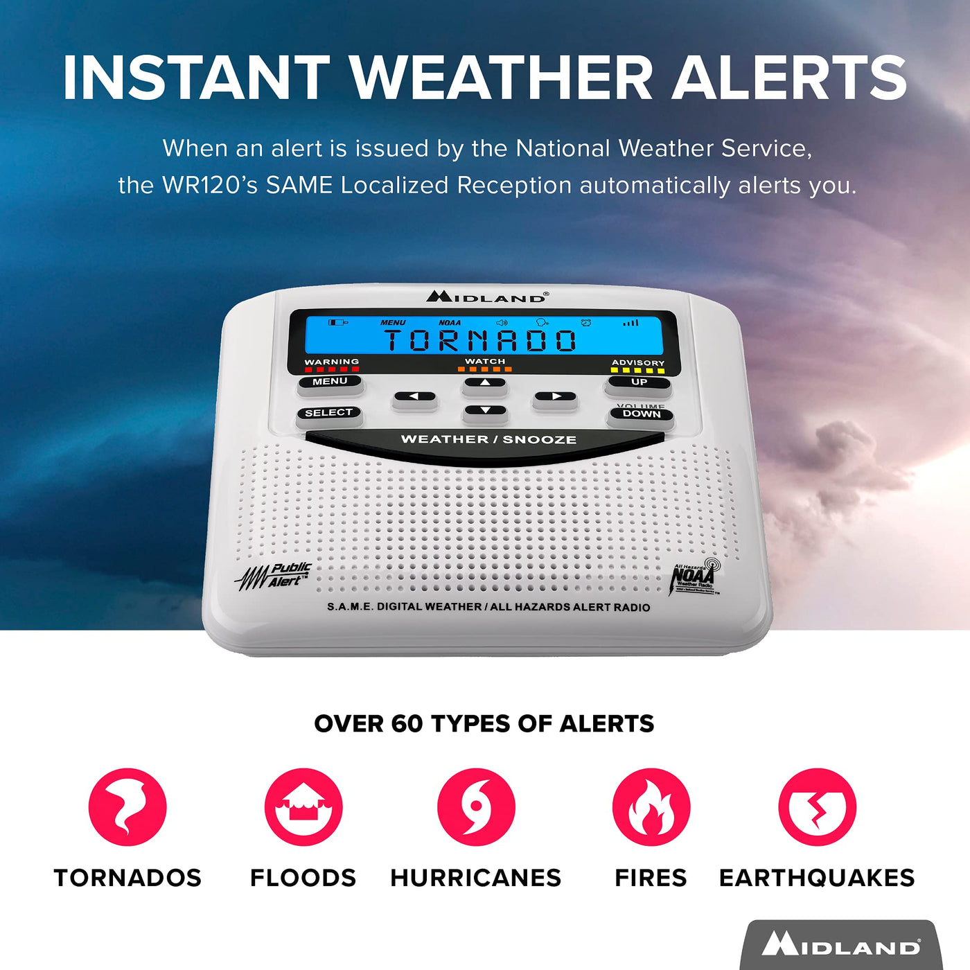 Read more Features: 25 programmable locations Over 80 weather and emergency alerts AM/FM radio Alert override Customizable alerts Color-coded alert level indicators Bilingual alerts in English, Spanish and French WR120 NOAA WEATHER ALERT RADIO Desktop Weather Alert & Alarm Clock The WR120 is the most trusted and popular weather radio on the market – features S.A.M.E. localized programming and alerts you to over 80 weather hazards and emergency alerts over an audible siren. When a severe weather watch or warning is issued by the National Weather Service, the WR120 automatically alerts you, giving you the ability to take proper action or seek shelter. Additional features: a clock with alarm and instant push-button local weather updates. Includes: All Hazards Weather Alert Radio AC Power Adapter Owner’s Manual Read more Real-Time Instant Weather With S.A.M.E. digital technology, get instant alerts from all 7 NOAA / Environment Canada Weather channels for your specific area. Hear Alerts When You Need Them Loud 90 dB siren alarm with selectable alert volume will sound during issued weather warnings to give you and your family the ability to take proper action or seek shelter. Keep Alert, Keep Safe Midland’s Emergency Solutions are recommended by the Department of Homeland Security for emergency preparedness. Read more Product Details Customize Your Alerts Over 80+ selectable emergency alerts with color-coded alert level indicators. Built-in Alarm Clock Helping you cut desktop clutter, the WR120 has a built-in timepiece and alarm clock system. Emergency Power Backup Access important information during a power outage with 3 "AA" batteries (not included). Trilingual Display All hazardous weather alerts can be selected to display one of three languages: Select from English, Spanish or French. Read more WR120B WR300 WR400 NOAA Alerts Yes Yes Yes AM/FM Radio No Yes Yes Siren Alarm 90dB 90dB 85dB Alerts 80+ 80+ 80+ Locations 25 23 25 Backup Power 3 - AA 4 - AA 4 - AA USB Charger Port No No Yes