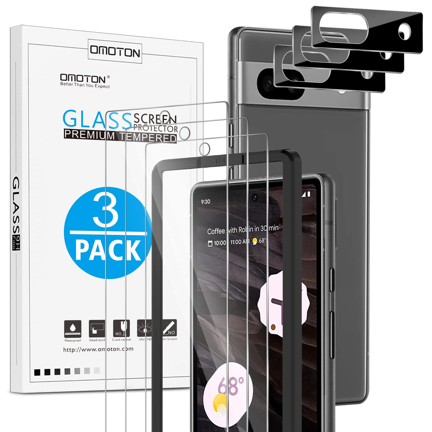 OMOTON [3+3 Pack] Screen Protector for Google Pixel 7A 5G, 3 Pack Pixel 7A screen protector & 3 Pack Camera Lens Protector, Alignment Frame/Tempered Glass/Anti Scratch, 6.1 Inch(2023 Released)