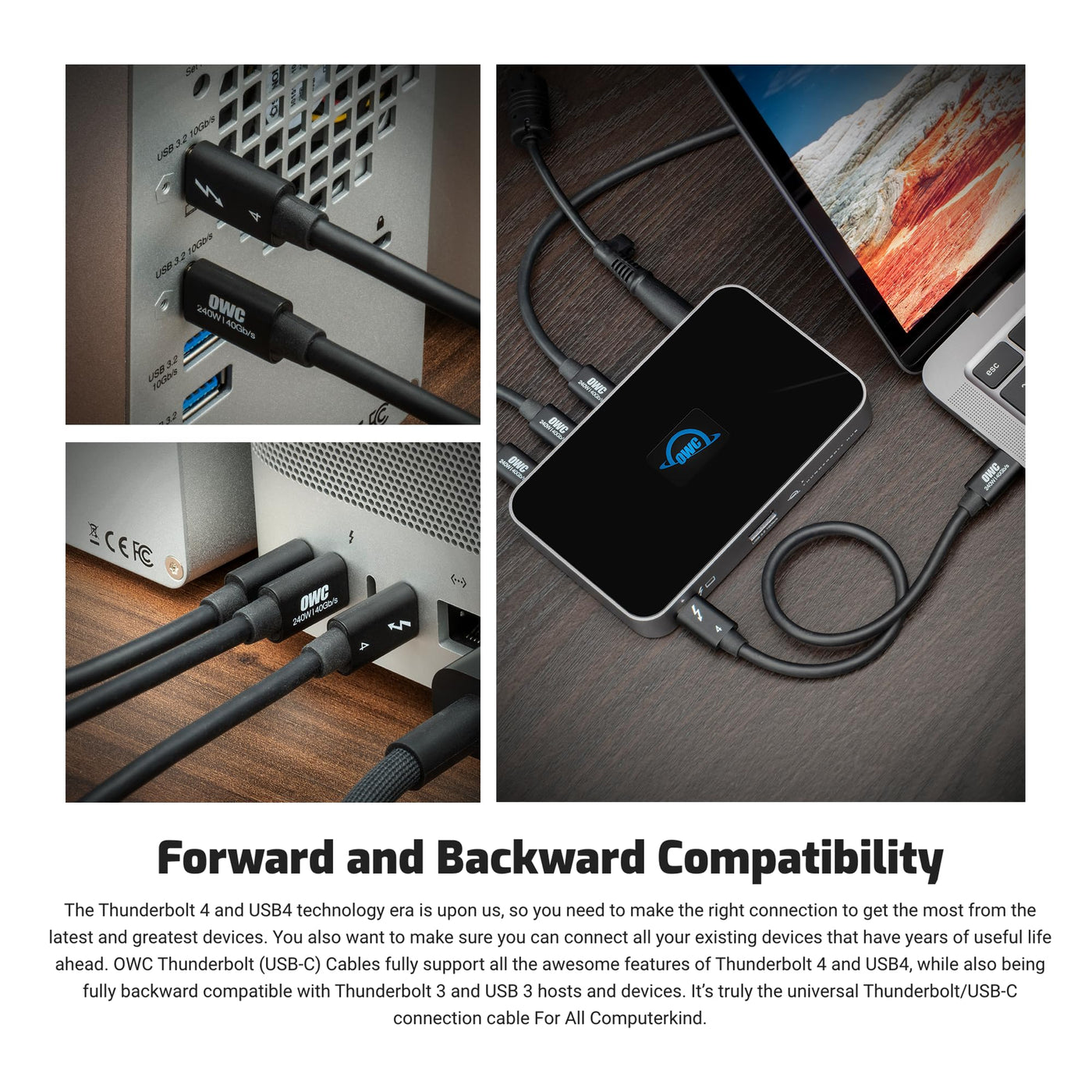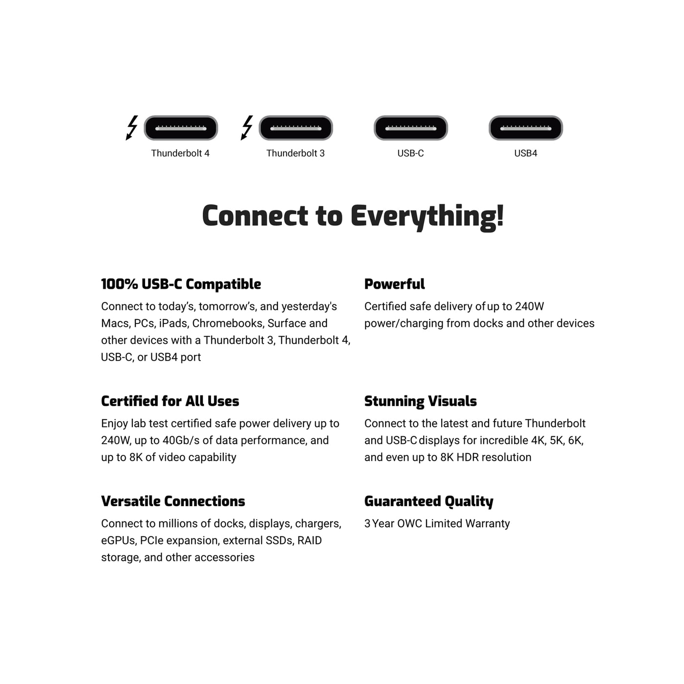 - 100% USB-C COMPATIBLE: The OWC Thunderbolt 4 Cable fully supports all the awesome features of Thunderbolt 4 and USB 4, while also being fully backward compatible with Thunderbolt 3 and USB 3 hosts and devices. A plug and play safe solution compatible with any Mac, PC, iPad, Chromebook, Surface tablet or any other device, display, or power supply with Thunderbolt 3, Thunderbolt 4, USB-C, or USB 4 port