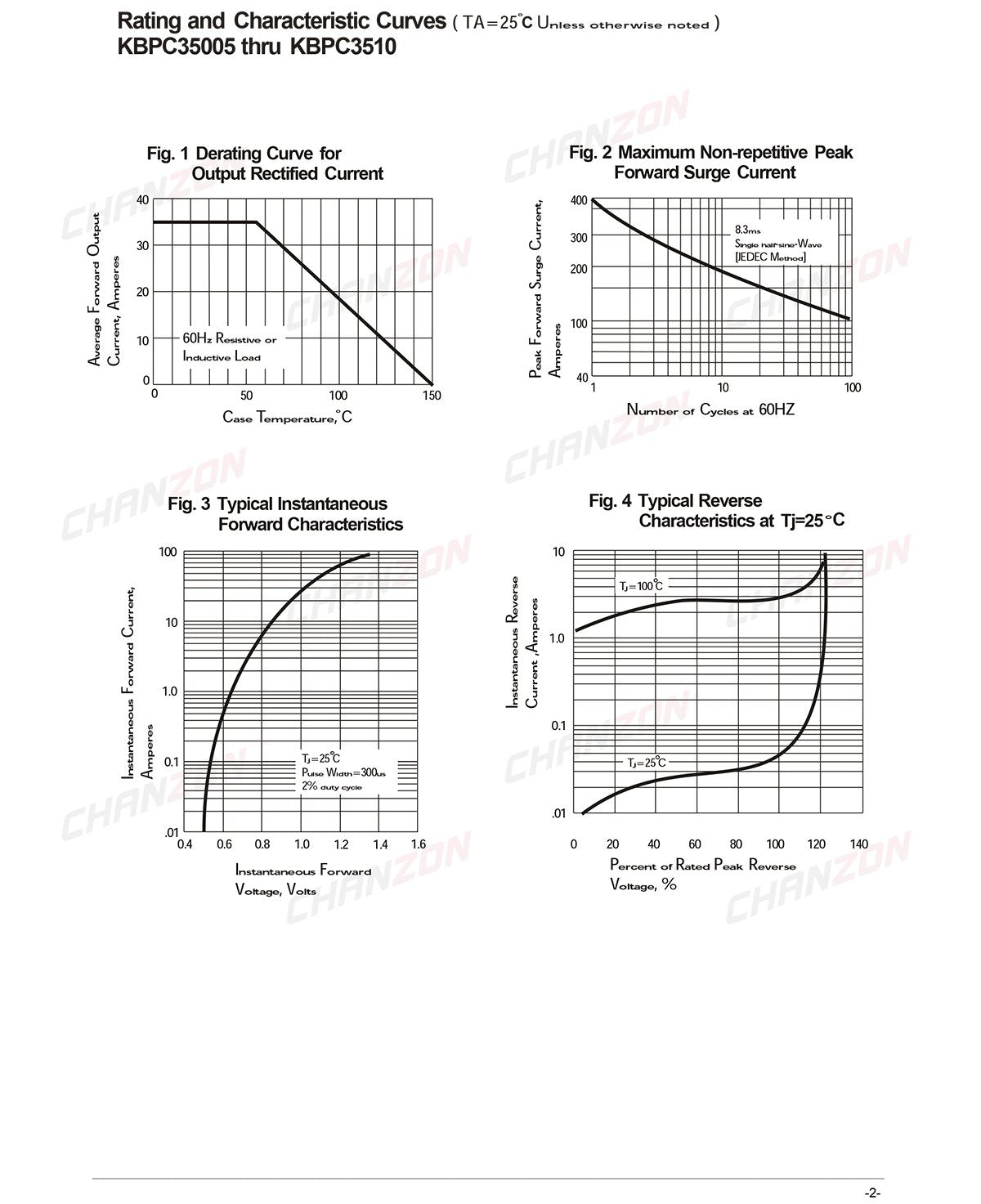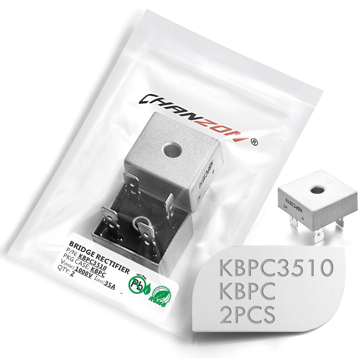Please refer to image 2-7 for the specification datasheet.Product Type: BRIDGE RECTIFIERBrand: ChanzonPart Number: KBPC3510Package Case: KBPCQTY: 2Note:Pack in a ESD Bag with Main Specs Label, for Long Time Protection and Indetification.