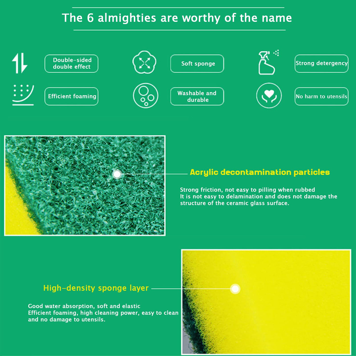 - Make Your Housework Easier: The green scrub side contains decontamination particles special grinding factor, durable and strong decontamination that can helps to tackle tough chores. The non-scratch soft yellow sponge side with good water absorption, suitable for scrubbing light oily tableware, fast cleaning without scratching.