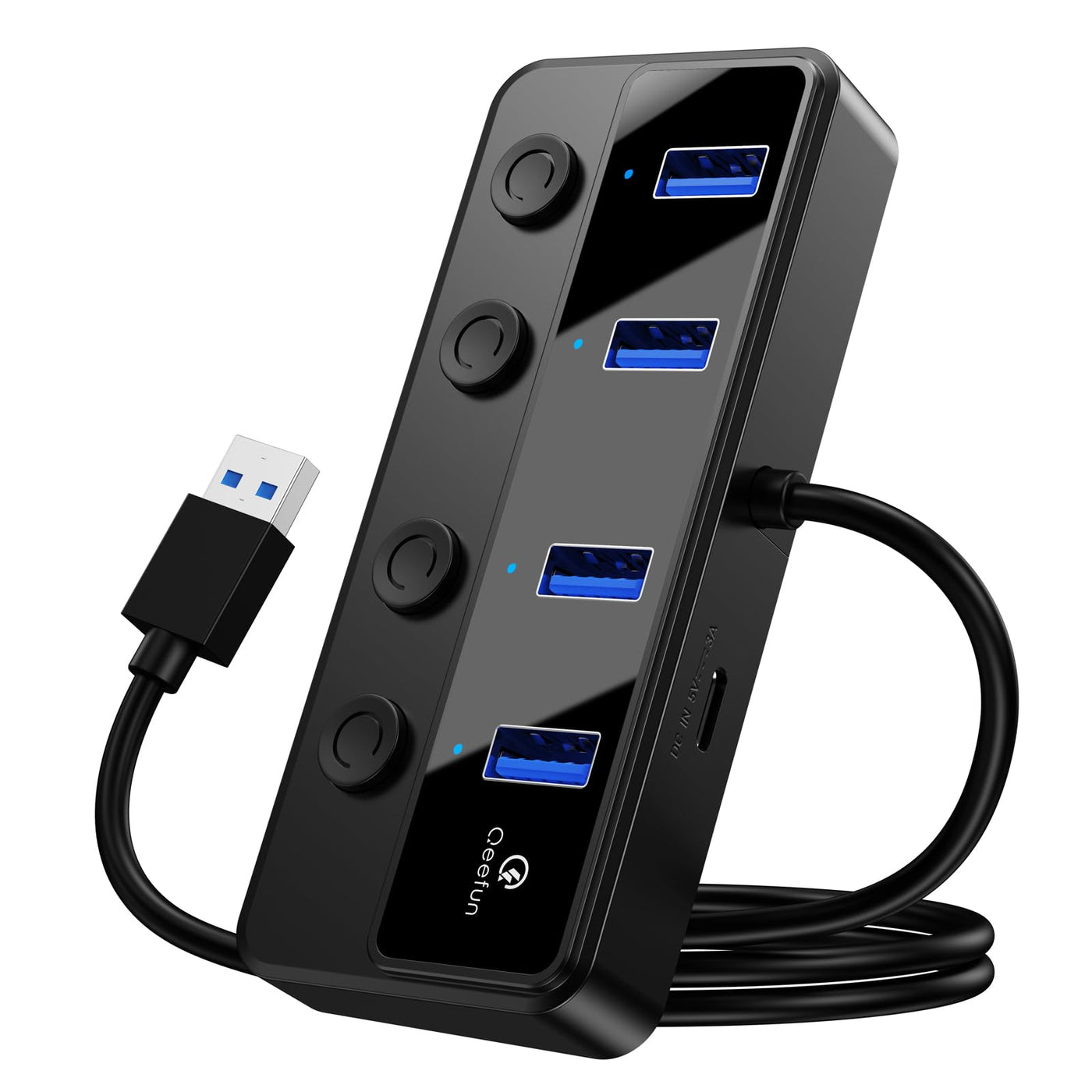 Qeefun 4-Port USB Hub 3.0, Individual LED Power Switches, 2ft USB Extension, 5V/3A USB Extender for Laptop, PC, USB Flash Drives, and More