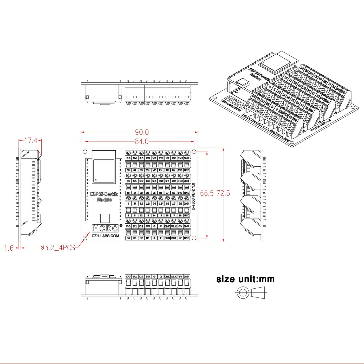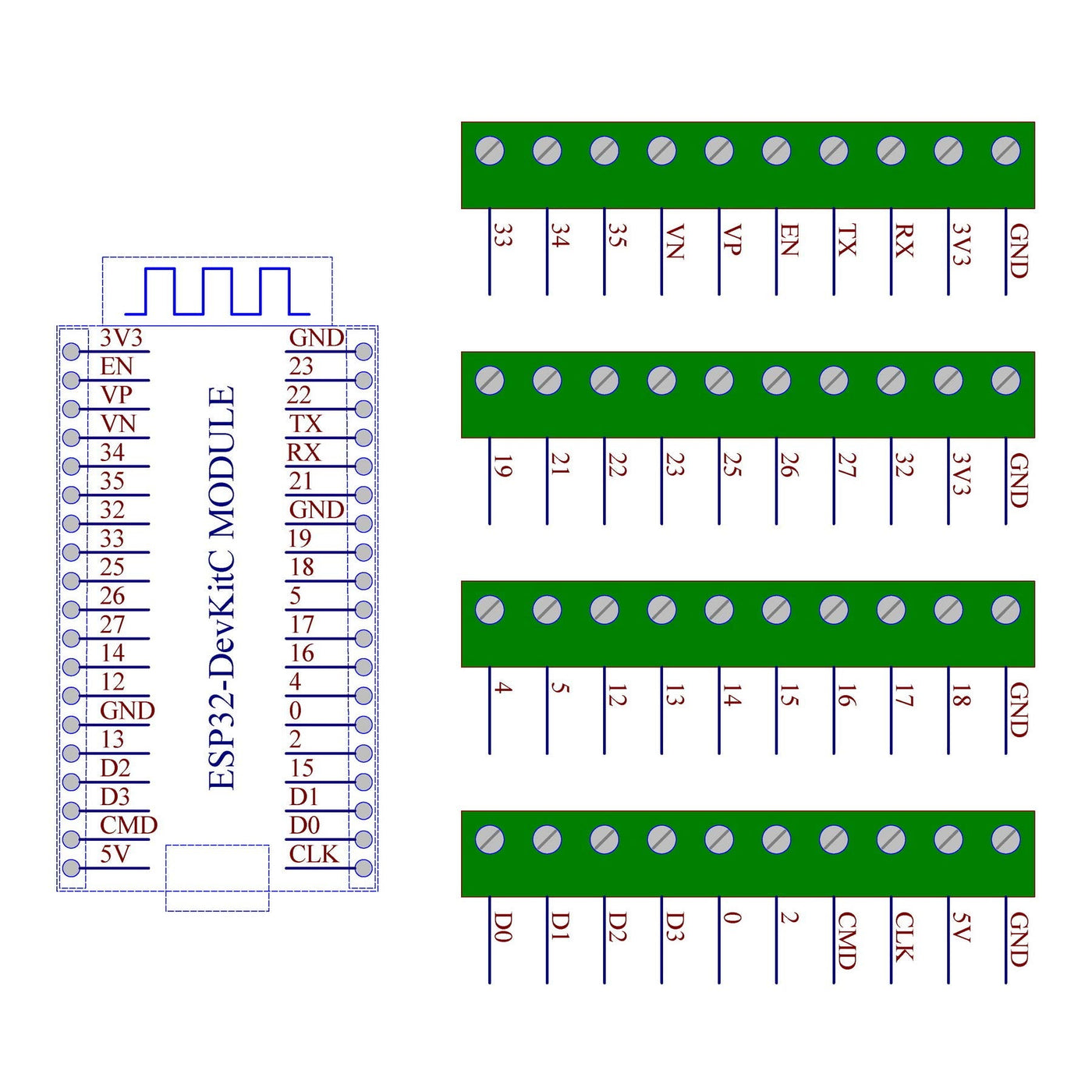 - Note: the item not include ESP32-DevKitC board. The breakour board supports ESPRESSIF official ESP32-DevKitC, but we do not guarantee whether to support third-party modules, you can check the ESPRESSIF official website for more information before buying.