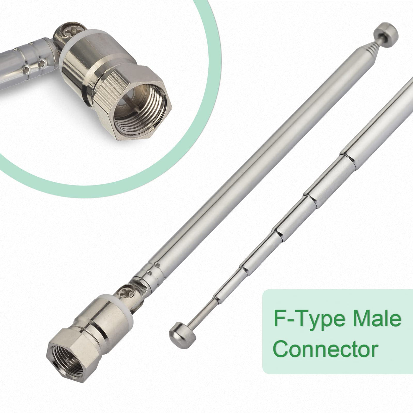 - Length:13.5CM / 5.3" included "F" connector ,Extend length:51CM / 20in included "F" connector ,Material: Steel, Brass
