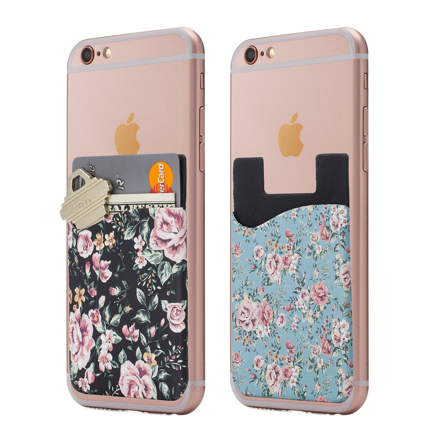 (Two) Floral Cell Phone Stick on Wallet Card Holder Phone Pocket for iPhone, Android and All Smartphones.