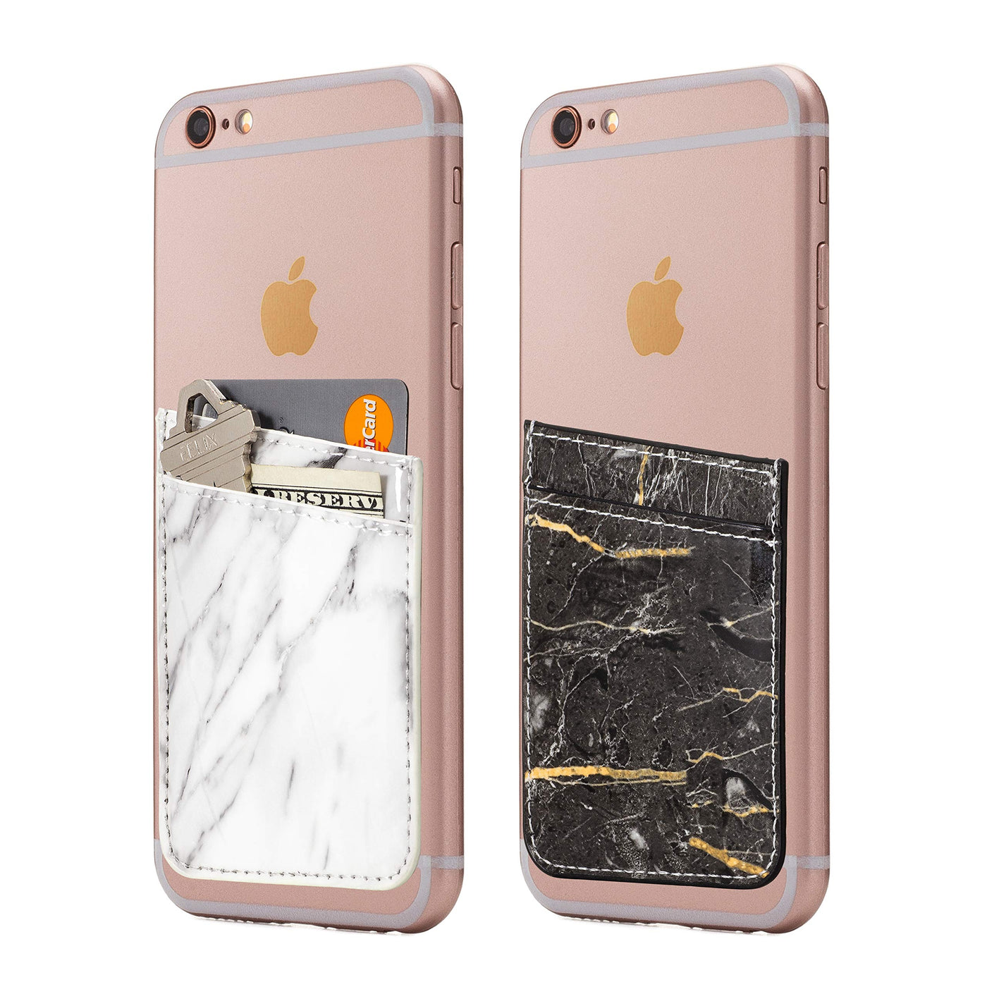 (Two) Leather Cell Phone Stick On Wallet Card Holder Phone Pocket for iPhone, Android and All Smartphones. (White & Black)