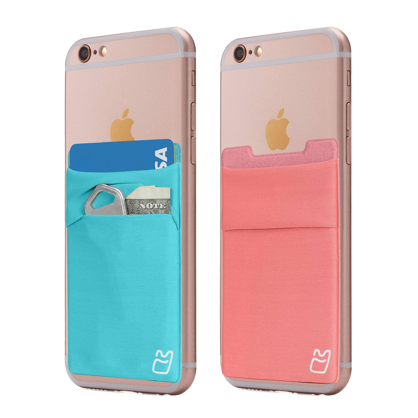 (Two) Stretchy Cell Phone Stick on Wallet Card Holder Phone Pocket for iPhone, Android and All Smartphones - (Teal & Orange) Coral