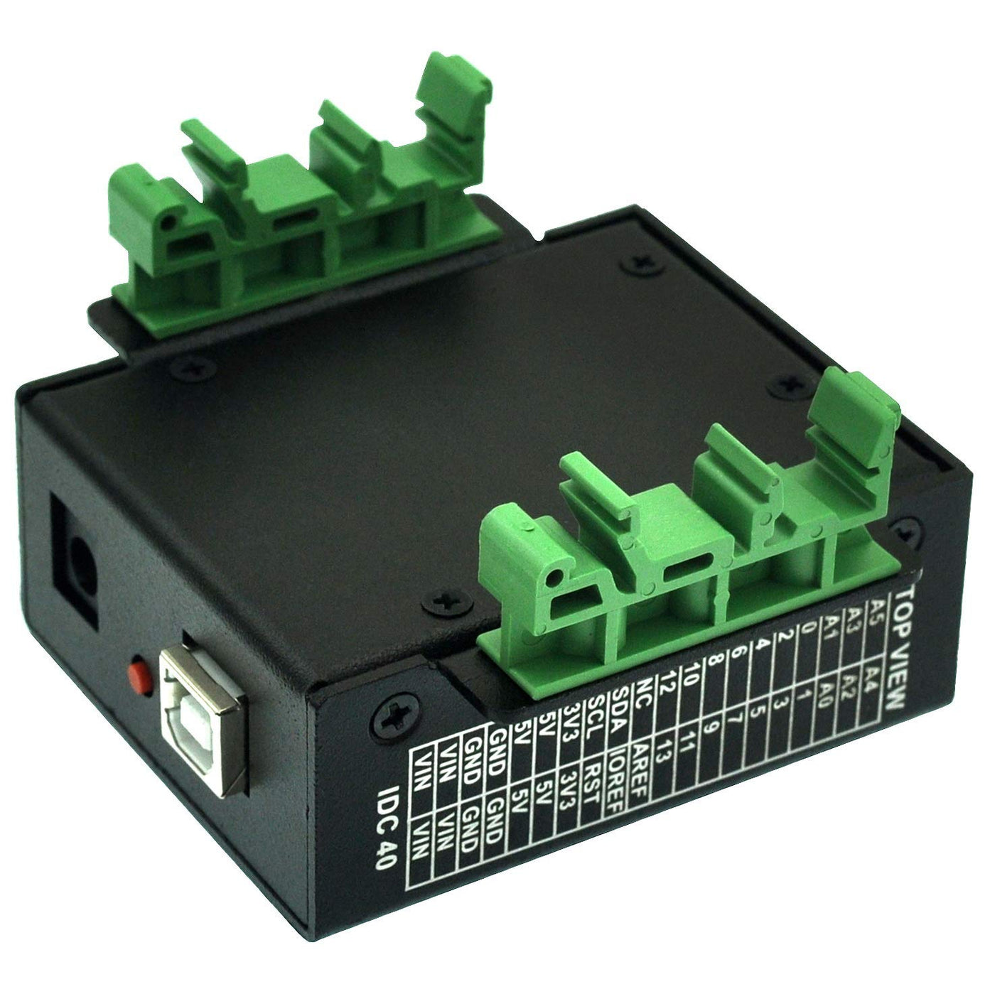 - Terminal block pitch 3.5mm/0.138", wire size range 26AWG to 16AWG, strip length 5mm, screw M2 steel, pin header and cage copper. Standard IDC40 pitch 0.1" header, you can use 40pin FRC(flat ribbon cable) connector cable connect all UNO pins to peripheral equipment. 6pin connector header support ICSP external connects.
