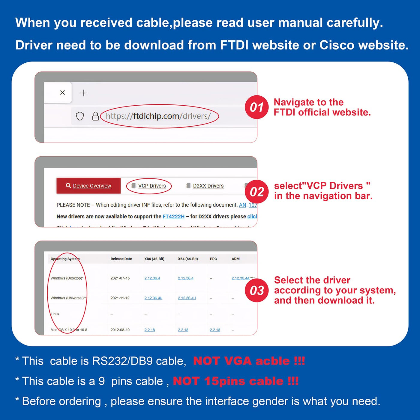 - !!Please NOTE: this is FEMALE RS232 to DB9 SERIAL CABLE ,Not VGA!!!It is 9 pin, NOT 15 pin!! Look carefully of the Pin is match with your device. Before ordering , please confirm the interface gender is waht you need. After receiving ,please read user manual /instruction at first and download the Driver at first from FT232 Official website or Cisco website . Customer service always online.